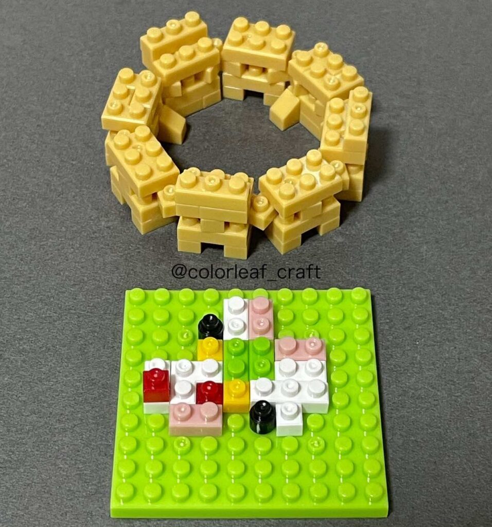 ダイソーのプチブロック(ウサギ)を1袋使い、大屋根リングを作ってみました。置いているミャクミャクはミニミニフィギュアです😊かわいい。